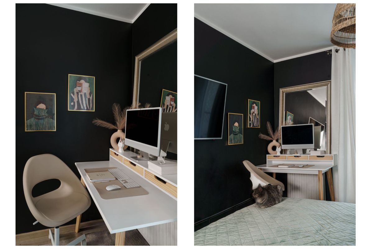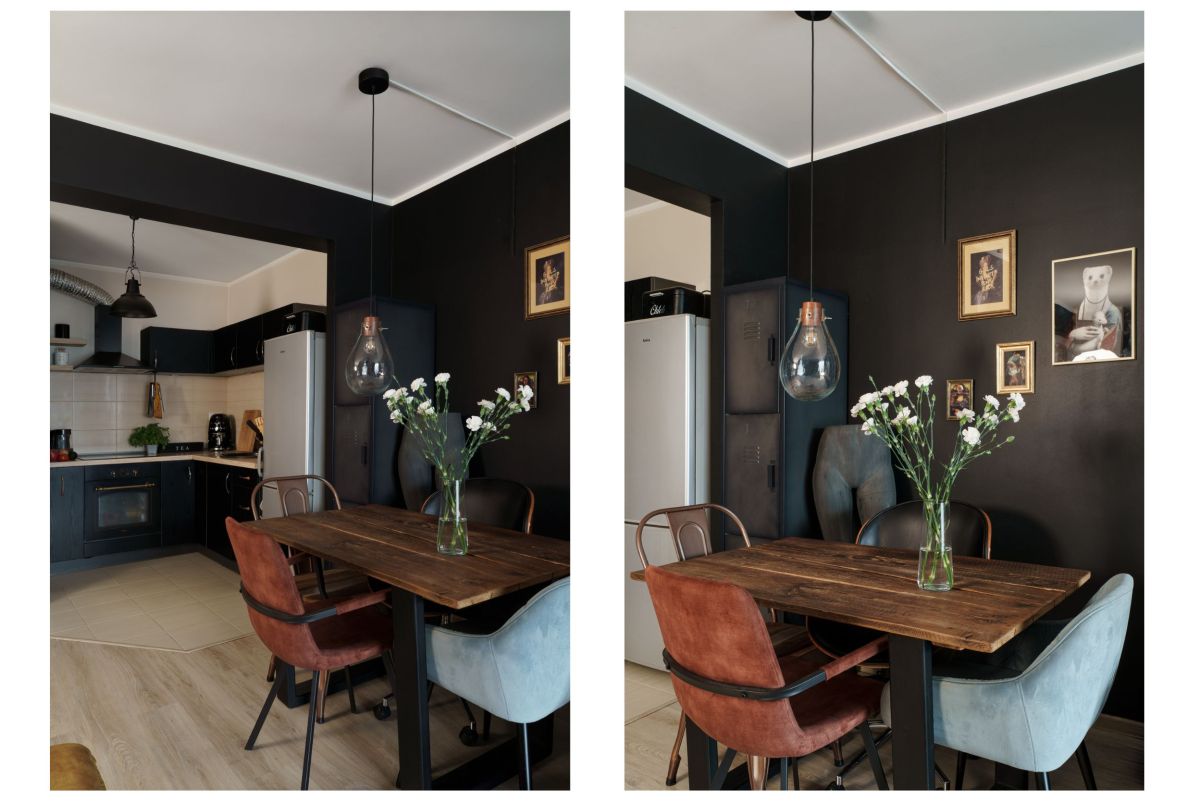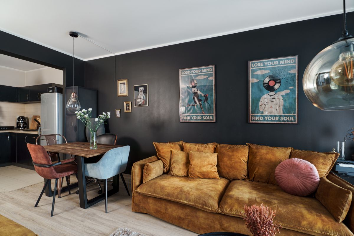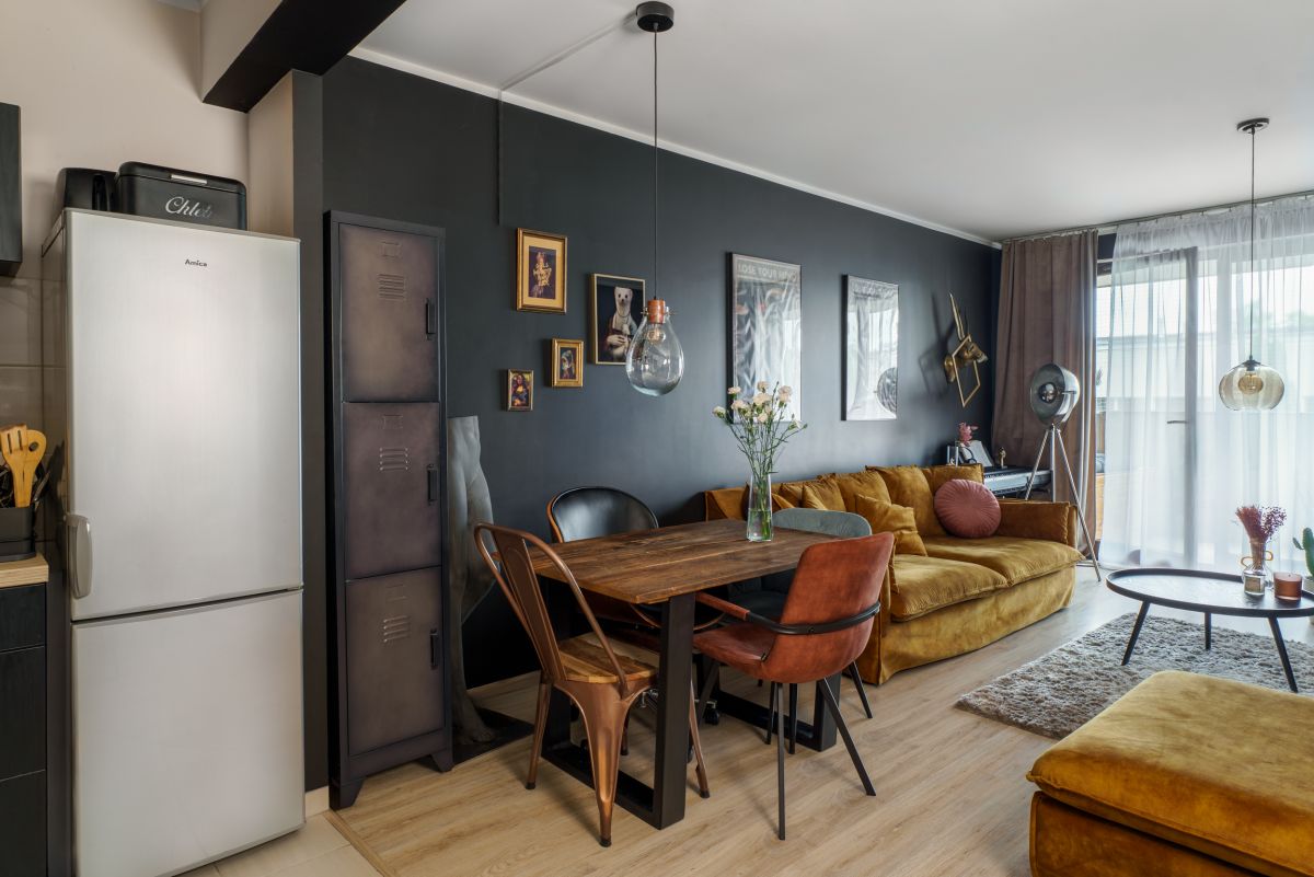 Wnętrze zaprojektowane zostało z wyczuciem stylu i charakterem, daleko odbiegającym od typowych, białych aranżacji. Drewniane okna i ciepłe panele podłogowe wprowadzają przytulny nastrój, a autorski projekt właścicielki dodaje całości artystycznego sznytu. To mieszkanie, które od razu przyciąga wzrok i zapada w pamięć!